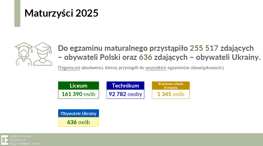 Do egzaminu maturalnego przystąpiło 255 517 zdających – obywateli Polski oraz 636 – obywateli Ukrainy w tym:
