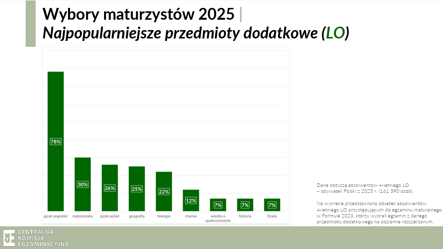 - 2 przedmioty dodatkowe wybrało 35,5% maturzystów z 4 letnich liceów oraz 22,7% maturzystów z 5 letnich techników,