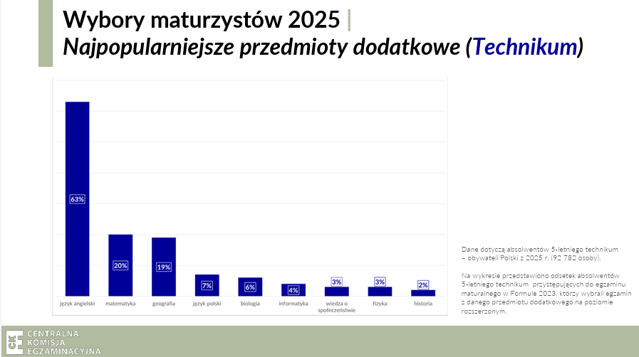 Natomiast maturzyści z 5-letnich techników wybierali następujące przedmioty dodatkowe: