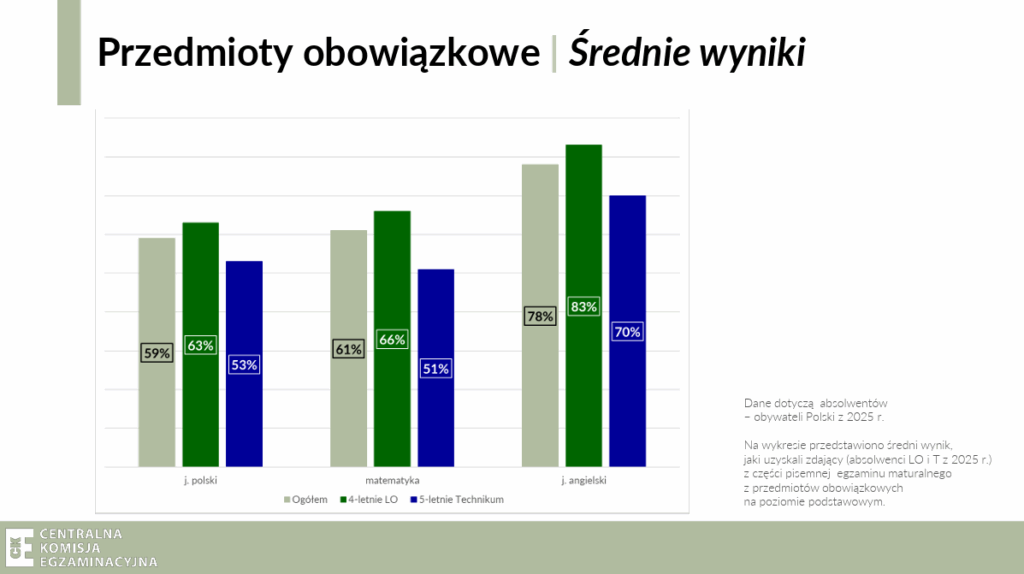 8 lipca 2025r. Centralna Komisja Egzaminacyjna opublikowała „Wstępne Informacje o Wynikach Egzaminu Maturalnego” dla terminu głównego egzaminu przeprowadzonego w dniach 8-22 maja 2025r. Tegoroczny egzamin maturalny był zdawany po raz trzeci w „Formule 2023” przez absolwentów 4-letniego liceum ogólnokształcącego i po raz drugi przez absolwentów 5-letniego technikum i szkół branżowych 2 stopnia na podbudowie 8-letniej szkoły podstawowej.