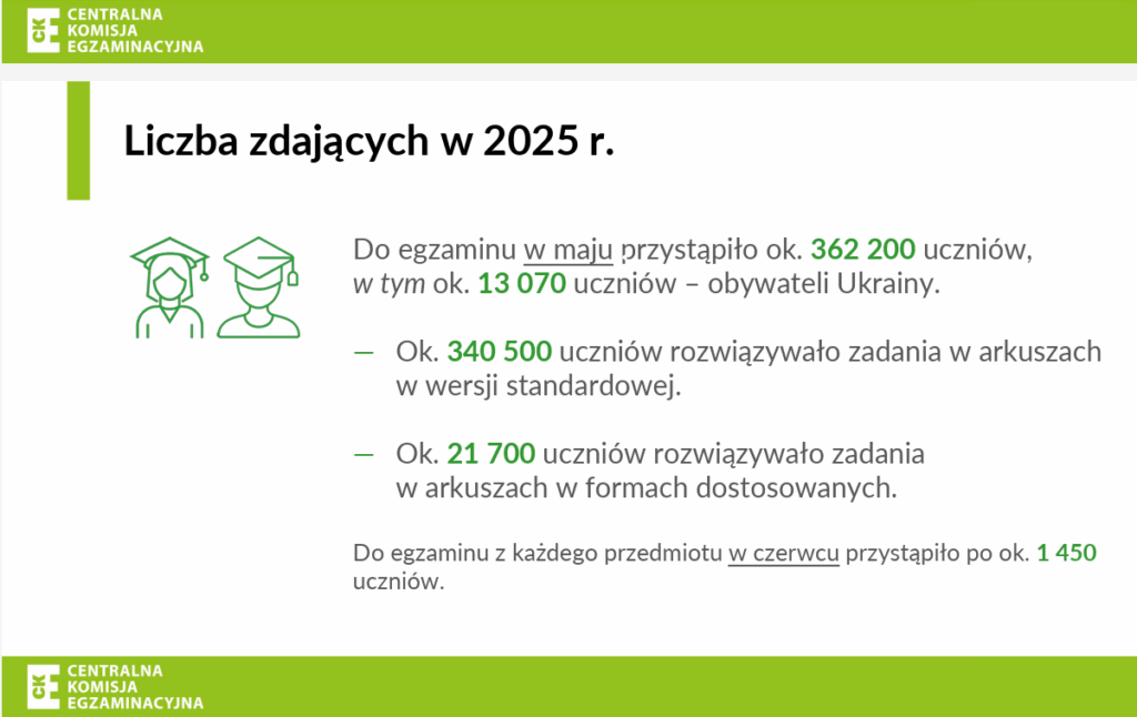 Do egzaminu ósmoklasisty w sesji głównej, tj. w maju 2025 r., przystąpiło ok. 362 200 spośród 374 2015 uczniów VIII klasy szkoły podstawowej (ok. 97%), w tym ok. 13 070 uczniów – obywateli Ukrainy.